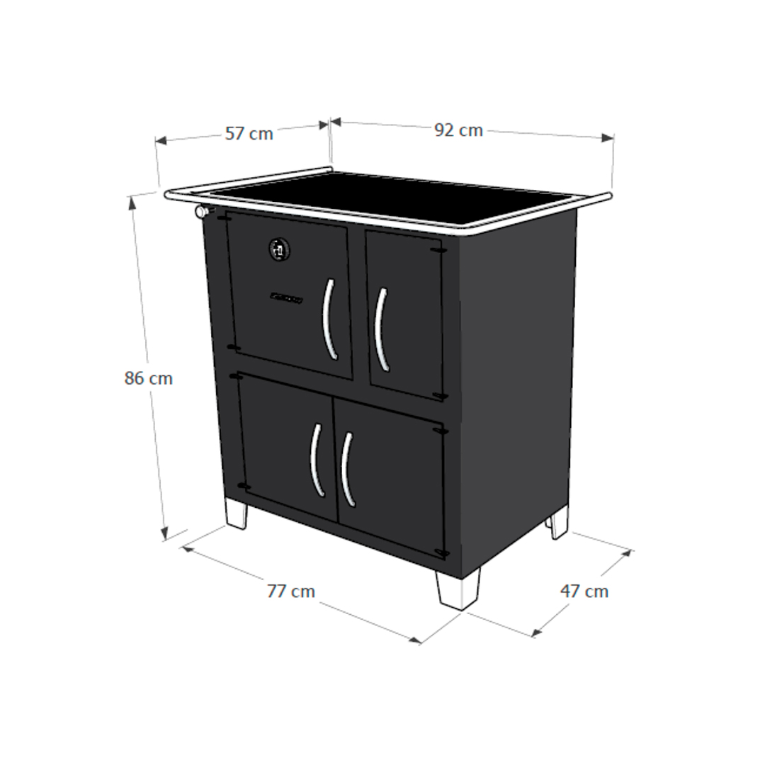 Fogão para quem deseja um forno com muito espaço e com design único, queimador para pedaços grandes de lenha e chapa vitrocerâmica para esquentar mais rápido, colocar comida direto na chapa e que dispensa o uso de lixas.
