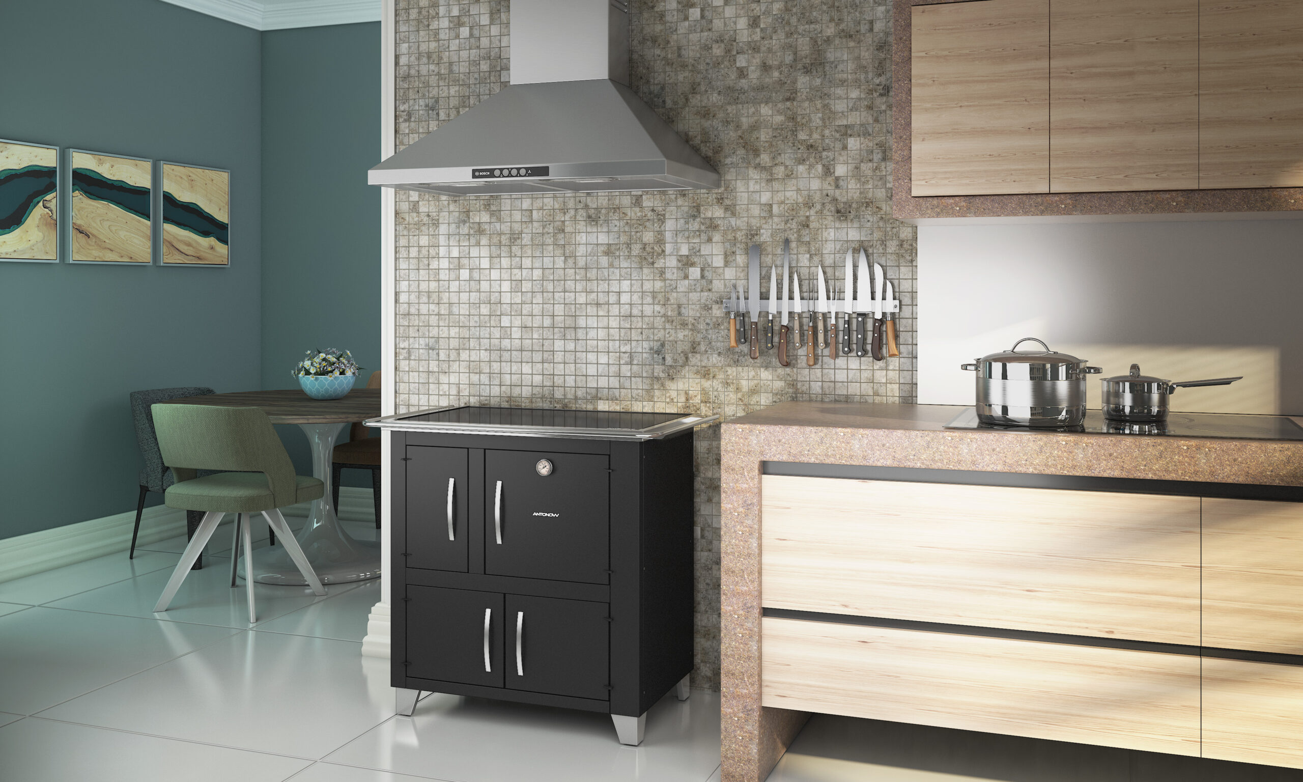 Cocina a leña para quien desea un horno con mucho espacio y con un diseño único, quemador para grandes piezas de leña y vitrocerámica para calentar más rápido, para colocar los alimentos directamente sobre la plancha, que no requiere el uso de papel de lija.